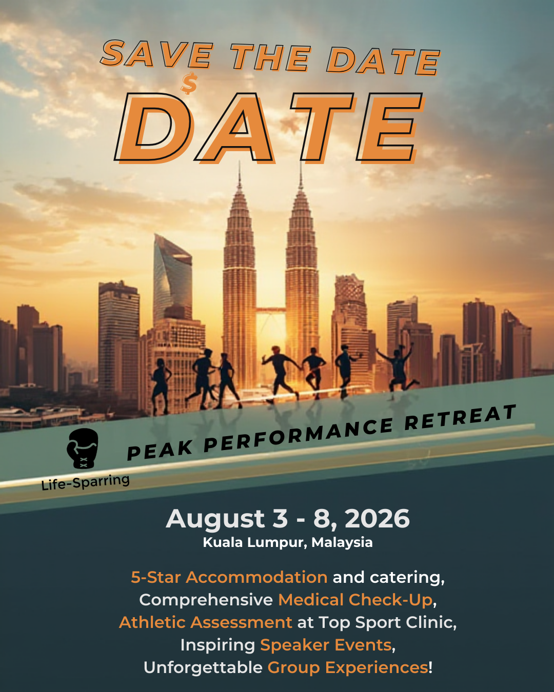 Life-Sparring aims to change this narrative and invites you to join us on our journey toward Peak Performance. Join our first group retreat in Kuala Lumpur in August 2026 for five days packed with comprehensive medical and physiological assessments, inspiring speakers, personal training, guidance, and a fun, supportive group dynamic in a luxurious 5-star environment.